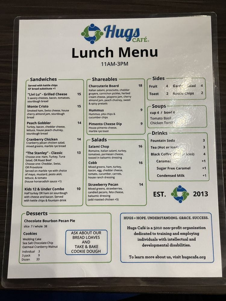 Welcome to Hugs Cafe, a heartwarming haven located at 224 E Virginia St, McKinney, TX. This charming establishment serves up an enticing menu centered around sandwiches and salads, crafted with fresh, high-quality ingredients. Every dish is prepared with care, embodying the cafe's mission of supporting adults with intellectual disabilities.